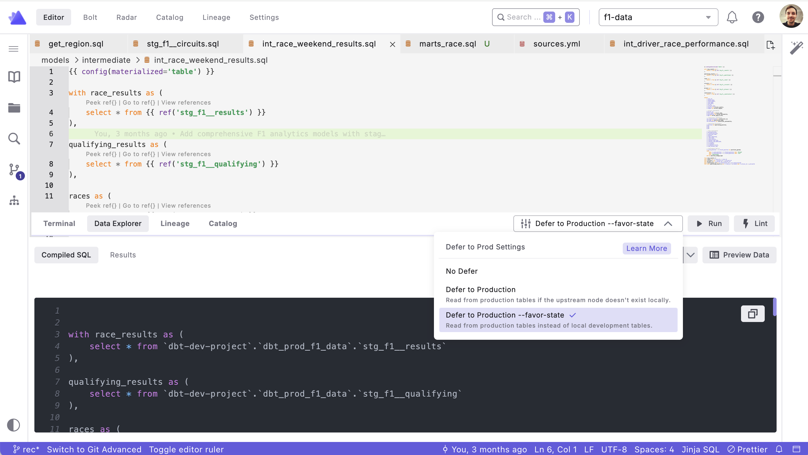 To illustrate the effect of using defer to prod, here's a comparison of compiled SQL for the same model: