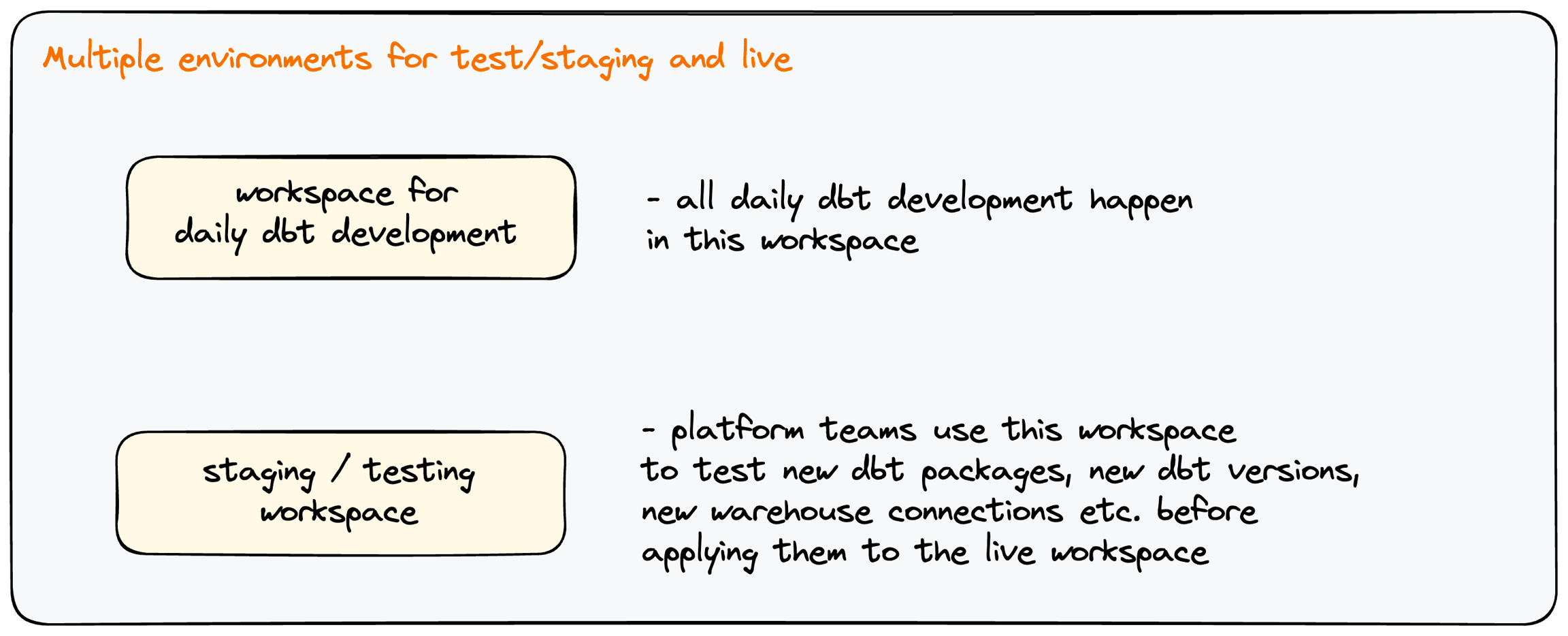 For organizations with many dbt™* projects, upgrading dbt™* versions without any impact on live projects is sometimes a priority for platform teams. Platform teams also like to test out different data warehouse configurations, dbt™* versions, macros, and packages before rolling them out to the rest of the analytics teams.