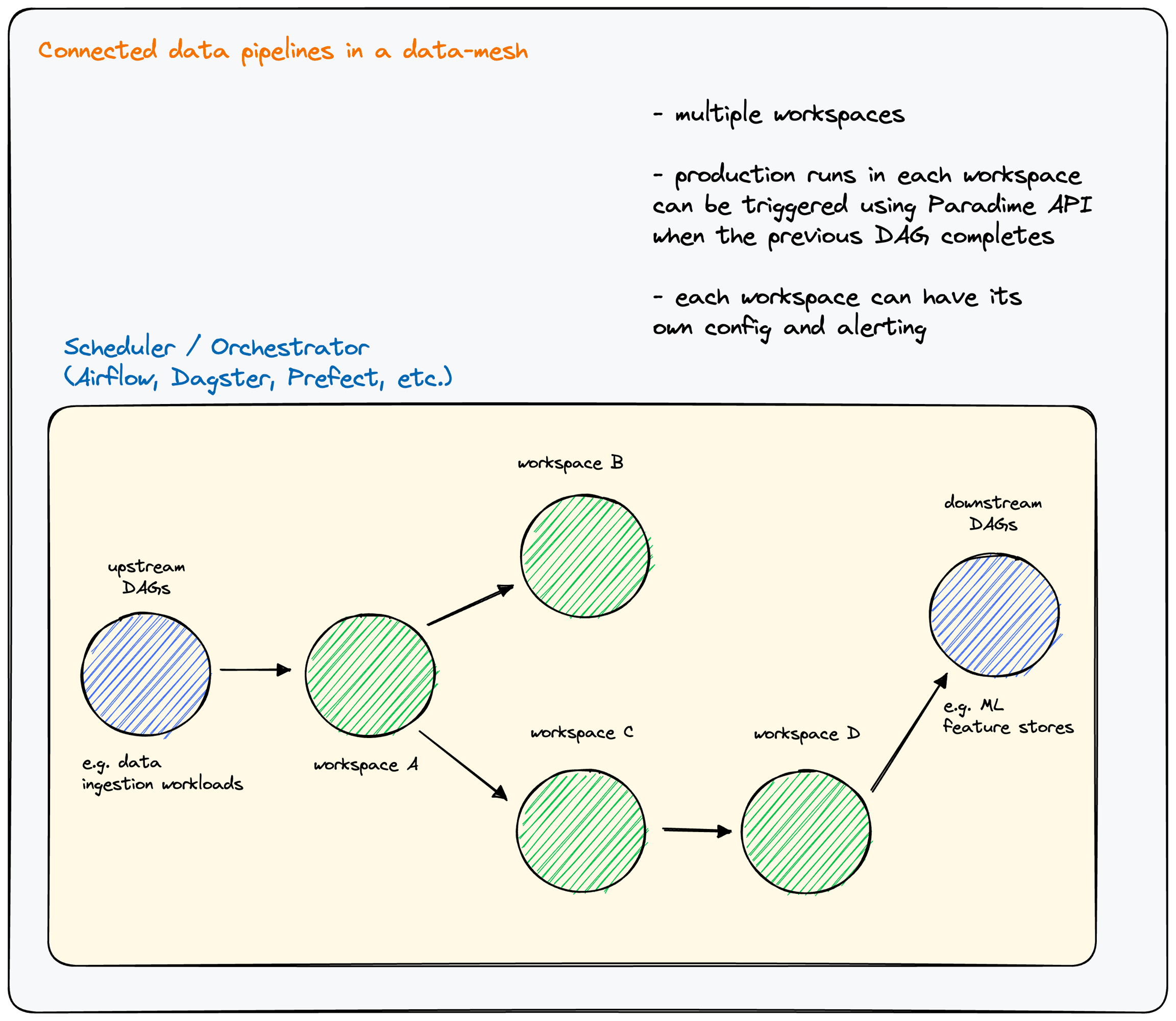 In a data mesh, people often refer to data products, which are outputs of one workspace that are consumed as inputs in another workspace. Organizations will need to model the dependency between workspaces within their scheduling and orchestration pipelines.Each Paradime workspace can have their own production dbt™* schedules.