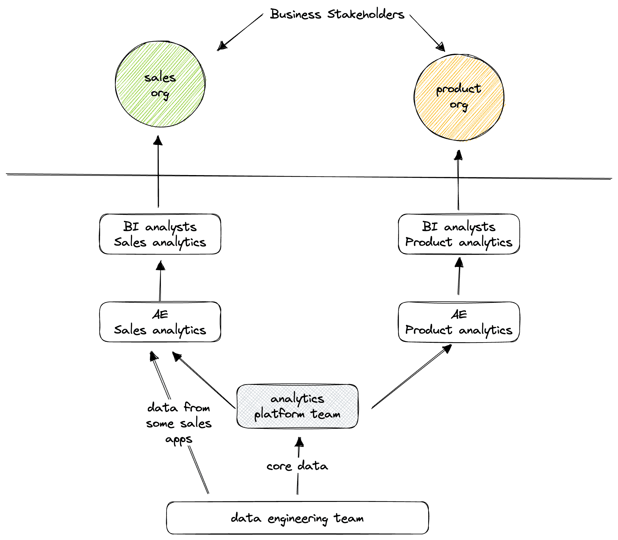 From an organizational perspective, we have seen many of our customers moving or considering moving to a distributed analytics team from a monolith. Many people call this team structure, hub-and-spoke model or domain-based team model. As companies grow, this is also the abstraction or how BI teams get organized. So, if we have to draw the organization structure around analytics with say, two business units - Sales and Product, it would look something like below.