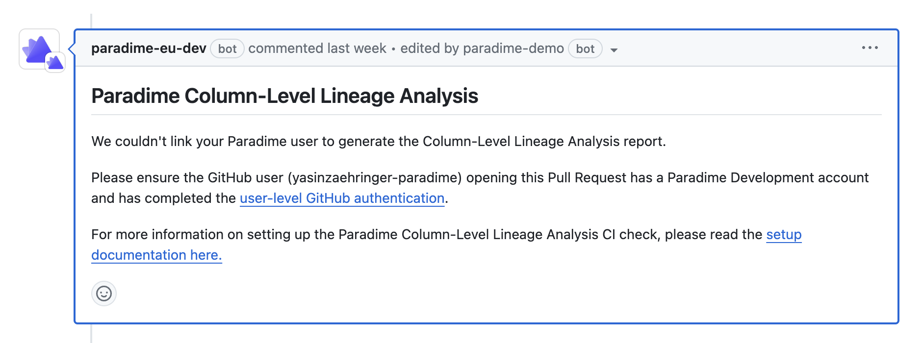 To fix this issue, make sure the user opening the Pull Request completed the [#github-user-level-oauth](https://docs.paradime.io/app-help/integrations/ci-cd/github#github-user-level-oauth "mention") in Paradime.