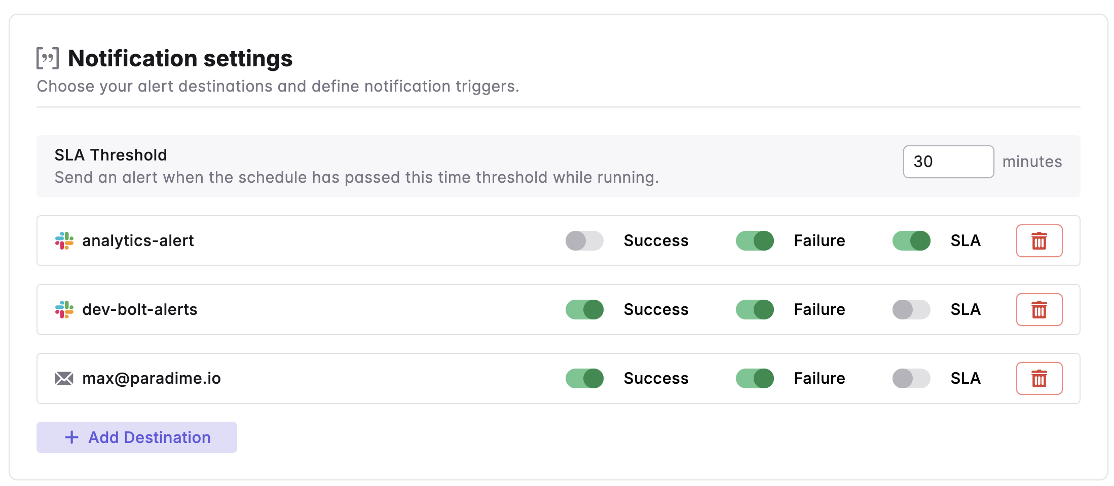 Paradime offers three notification options, allowing you to choose destinations based on your team’s communication preferences: [Email](#email-notifications), [Slack](#slack-notifications), and [Microsoft Teams](#microsoft-teams-notifications).