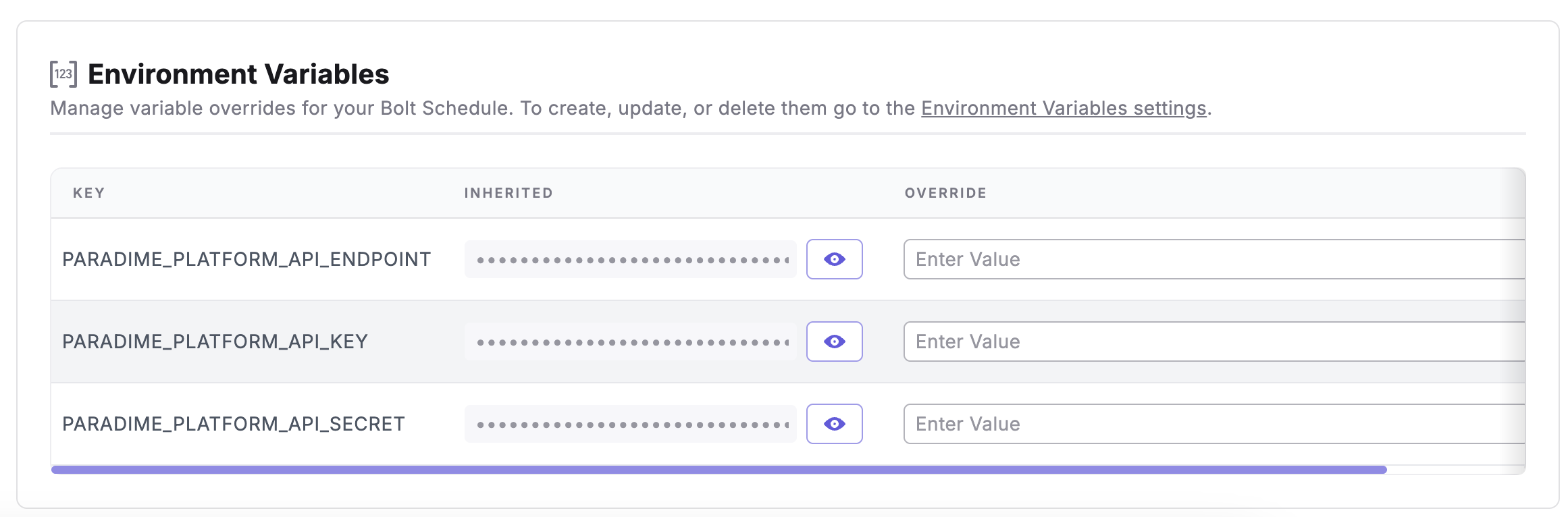 After configuring the Notifications Settings for a Bolt Schedule, you can override your Bolt environment variable values for specific schedules. This allows you to customize variable values per schedule without affecting your global environment configuration.