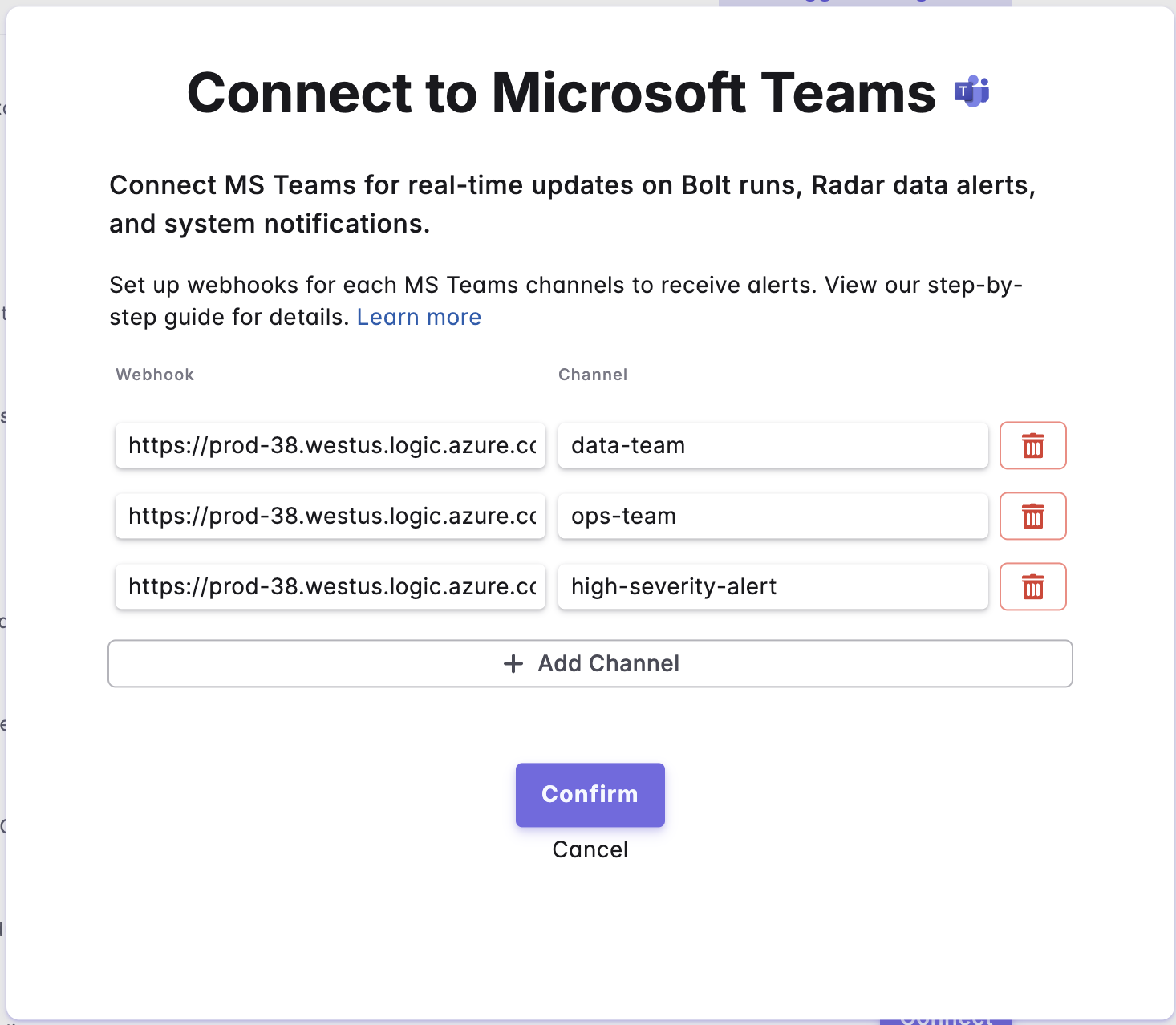 When done, click on `Confirm` to complete the setup of the MS Teams integration. You can now setup MS Teams notifications for Bolt Schedules and Data Alerts.
