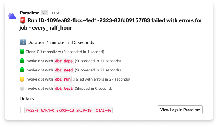 The Slack integration in Paradime enables you to send alerts to a Slack channel and/or Slack users when a schedule run succeeds or fails.