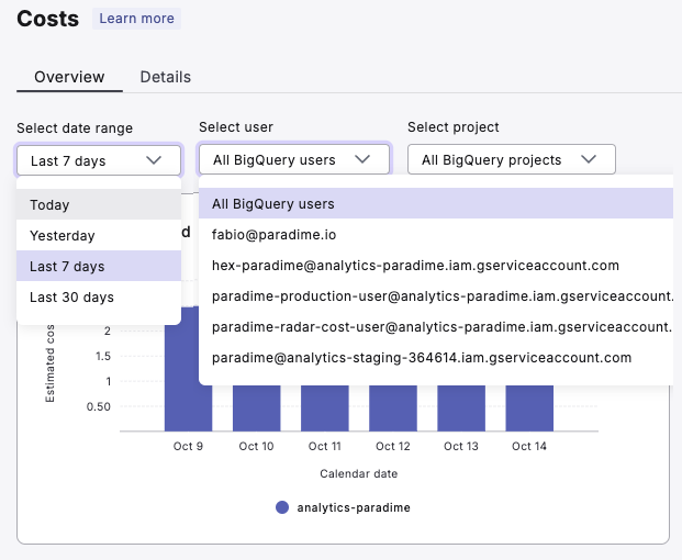 Paradime's BigQuery Cost Monitoring dashboard provides comprehensive insights into your BigQuery usage and costs. This tool enables you to monitor, analyze, and optimize your BigQuery operations, helping you make data-driven decisions to reduce expenses without compromising performance.