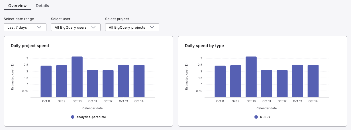 The Overview section gives you a broad perspective on your BigQuery costs and usage patterns, allowing you to uncover key insights, including: