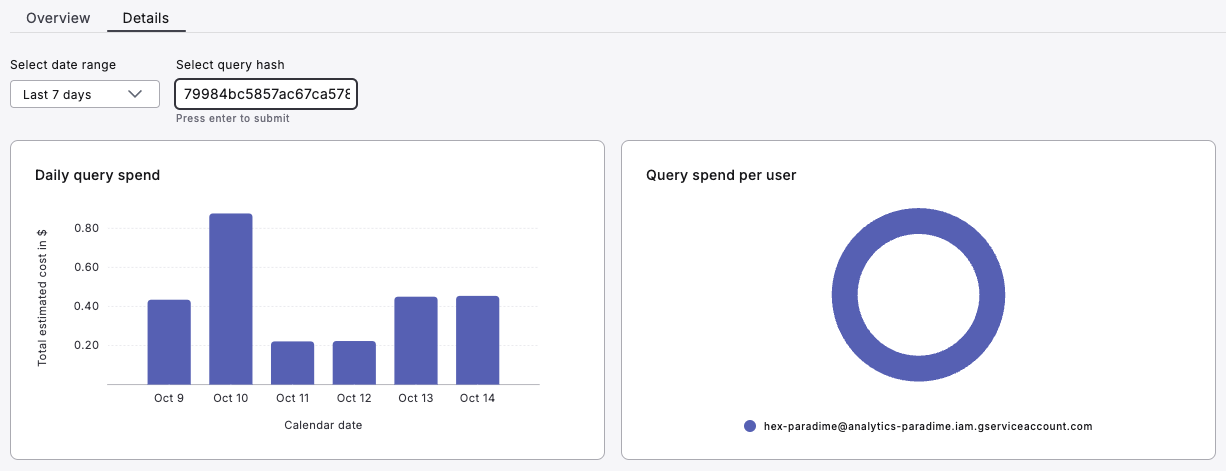 The Details section allows you to dive deep into specific query performance and cost metrics, providing comprehensive insights such as: