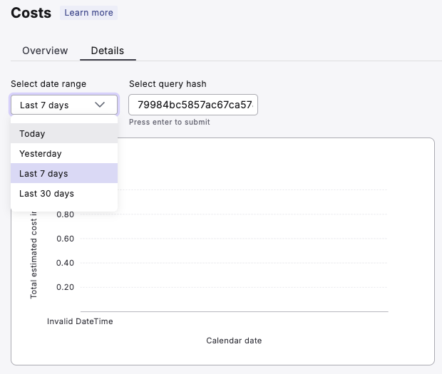 2. In the Details section, use the "Select date range" dropdown and the query hash input to analyze specific time periods and queries.