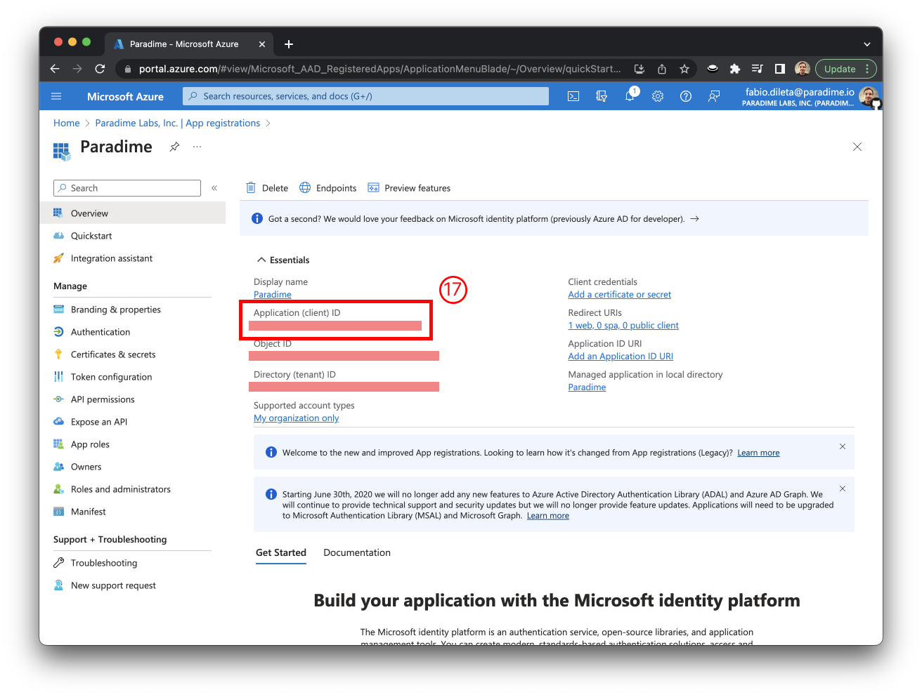 17. Select the Application you created the previous steps and in the `Overview` page copy the **Application (client) ID**