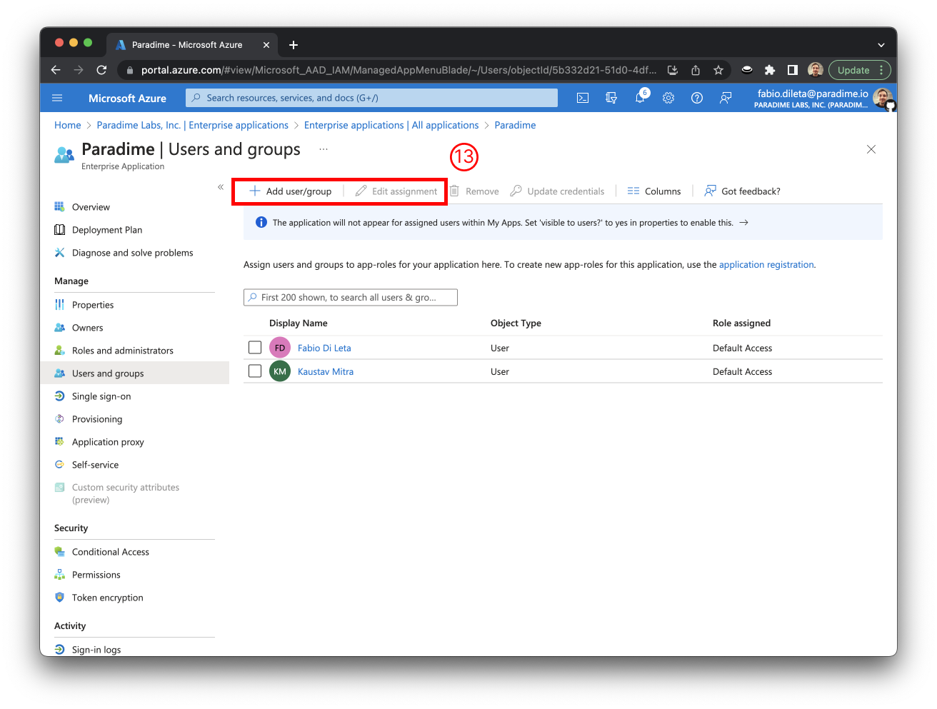 ### Adding Users to an Enterprise Application[​](https://app.dev.paradime.io/_help/92e9662/sso-azure-ad#adding-users-to-an-enterprise-application) <a href="#adding-users-to-an-enterprise-application" id="adding-users-to-an-enterprise-application"></a>
