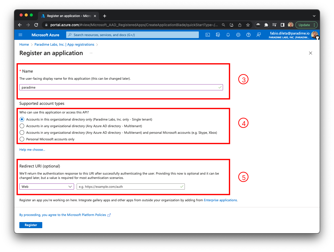 5. From the dropdown, select the `Web` option, enter the **Redirect URI** based on your region and click on the `Register` button.