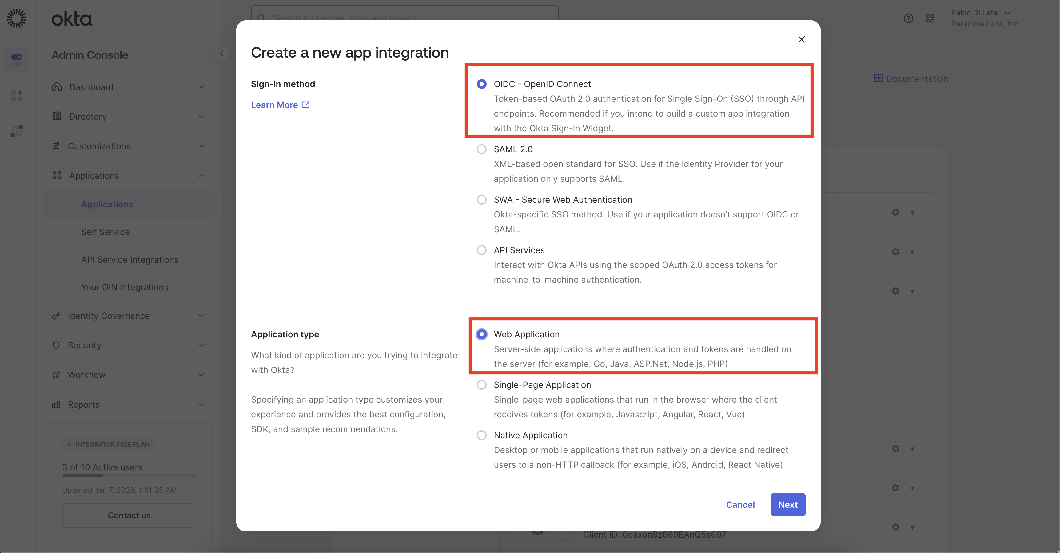 Select Create New App. Choose OIDC as the Sign-in method. Choose Web Application as your Application Type. Select Next.