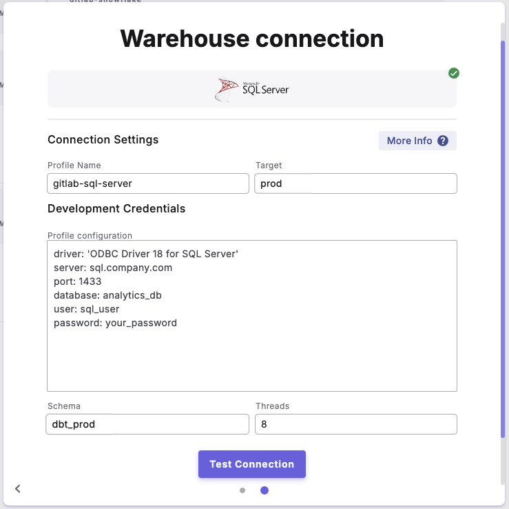 <table><thead><tr><th width="208">Field</th><th width="210">Description</th><th width="167">Example</th><th width="138">Default Value</th><th width="121">Required</th></tr></thead><tbody><tr><td>driver</td><td>OBDC driver</td><td><code>ODBC Driver 18 for SQL Server</code></td><td><code>ODBC Driver 18 for SQL Server</code></td><td>✅</td></tr><tr><td>server</td><td>Server hostname or IP</td><td><code>sql.company.com</code></td><td>None</td><td>✅</td></tr><tr><td>port</td><td>Server port number</td><td><code>1433</code></td><td><code>1433</code></td><td>✅</td></tr><tr><td>database</td><td>Database name</td><td><code>analytics_db</code></td><td>None</td><td>✅</td></tr><tr><td>schema</td><td>Schema name. <br><br>This is configured in the UI "Schema" field</td><td><code>dbo</code></td><td>None</td><td>✅</td></tr><tr><td>user</td><td>Authentication username</td><td><code>sql_user</code></td><td>None</td><td>✅</td></tr><tr><td>password</td><td>Authentication password</td><td><code>your_password</code></td><td>None</td><td>✅</td></tr><tr><td>retries</td><td>Number of query retry attempts</td><td><code>3</code></td><td><code>1</code></td><td>❌</td></tr><tr><td>encrypt</td><td>Enable connection encryption</td><td><code>true</code></td><td><code>true</code></td><td>❌</td></tr><tr><td>trust_cert</td><td>Trust server certificate</td><td><code>false</code></td><td><code>false</code></td><td>❌</td></tr><tr><td>login_timeout</td><td>Connection timeout in seconds</td><td><code>10</code></td><td><code>0</code></td><td>❌</td></tr><tr><td>query_timeout</td><td>Query timeout in seconds</td><td><code>300</code></td><td><code>0</code></td><td>❌</td></tr><tr><td>schema_authorization</td><td>Schema owner principal</td><td><code>db_owner</code></td><td>None</td><td>❌</td></tr></tbody></table>